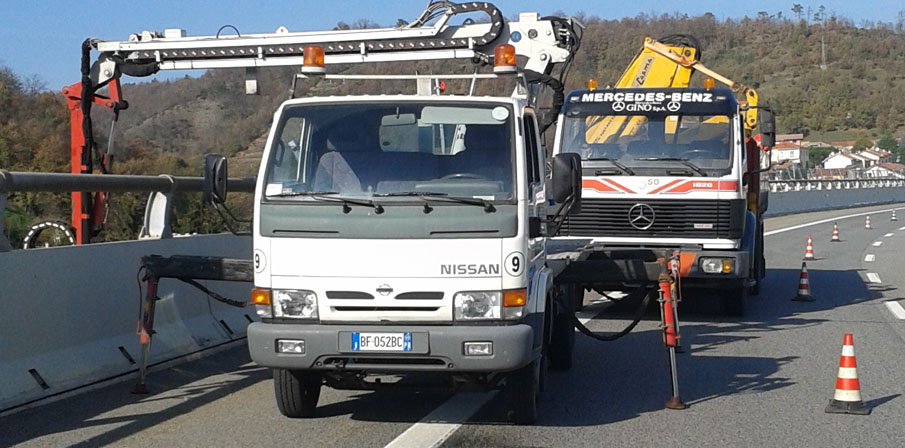 Un autocarro è dotato di cestello che si estende verticalmente sia in positivo, sia in negativo, al fine di essere utilizzato a lato e sottostante ai viadotti.